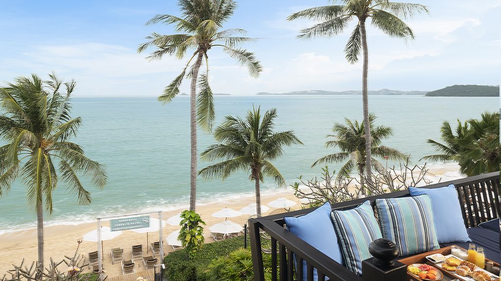Our luxury beach suites enjoy a prime beachfront location in Koh Samui with 180° sea views. Wake up in a sumptuous four-poster bed in your luxury suite with beach views. Spend sunny days out on your wrap-around balcony. Soak in a terrazzo tub for two, with partition slid open to reveal the sea.