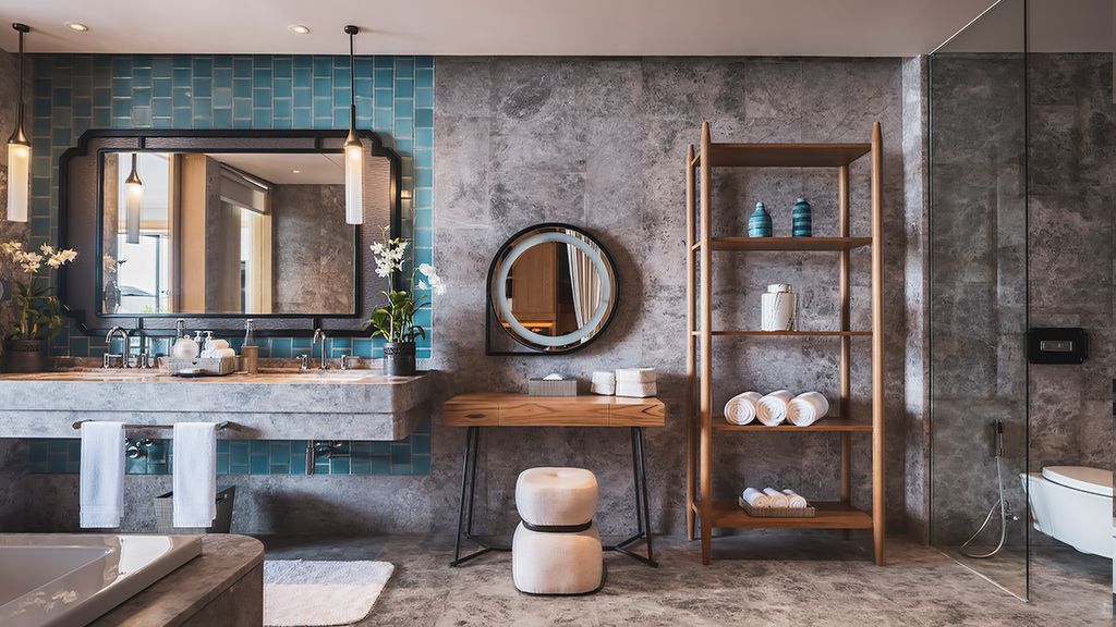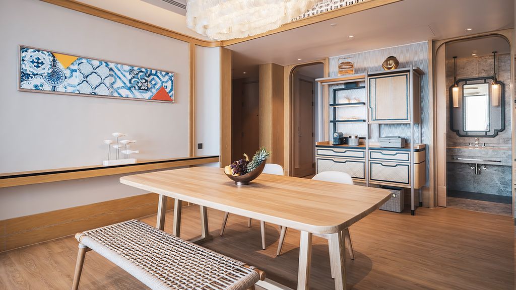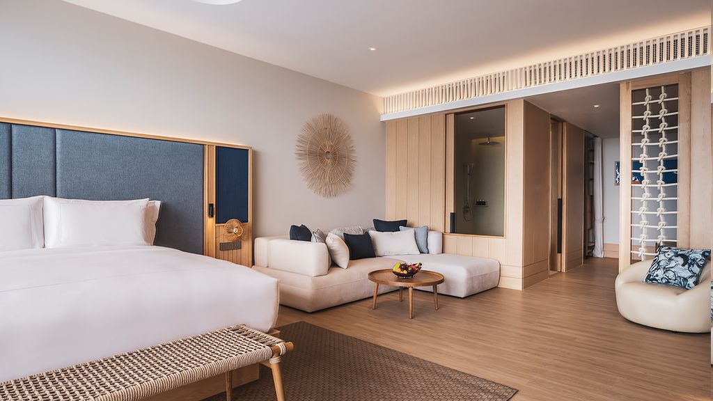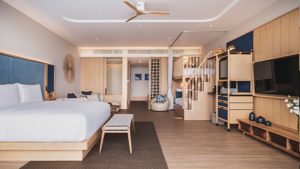 91 SQM Family Pool View Suite with King Bed, Free Wi-Fi, Kids Bunk Beds, Private Balcony, Drinks cabinet with coffee machine provided, Bathroom with a separate tub and a rain shower.