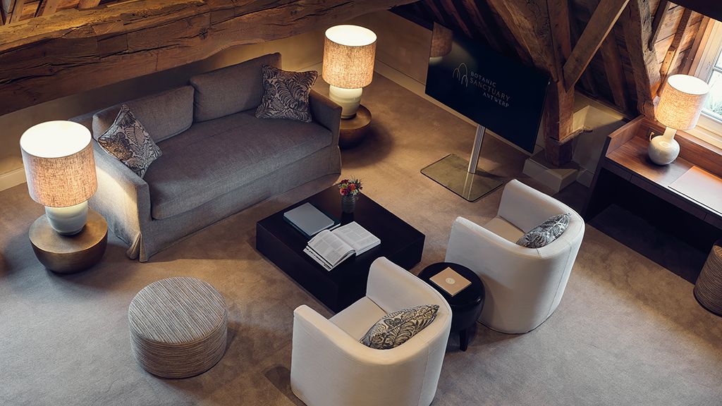The spa suite meets expectations of travelers seeking for pure relaxation in the heart of antwerp. With its own welness including sauna, technogym bike, treatment table and whirlpool, it cocoons guests during their stay. This unique suite has 2 charming bedrooms, 2 luxurious bathrooms, expansive couch in the living area, kitchenette and dinner table. This suite provides all amenities you may inquire including a minibar and coffee - making facilities. The suite is 140 sqm / 1500 sft and offers courtyard/ garden views. Our guests have free access to the botanic gym and health spa.