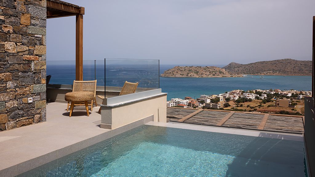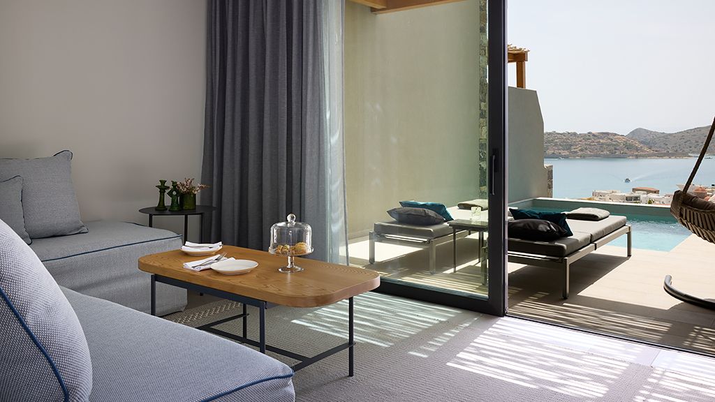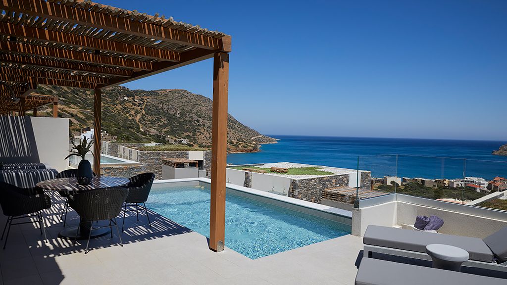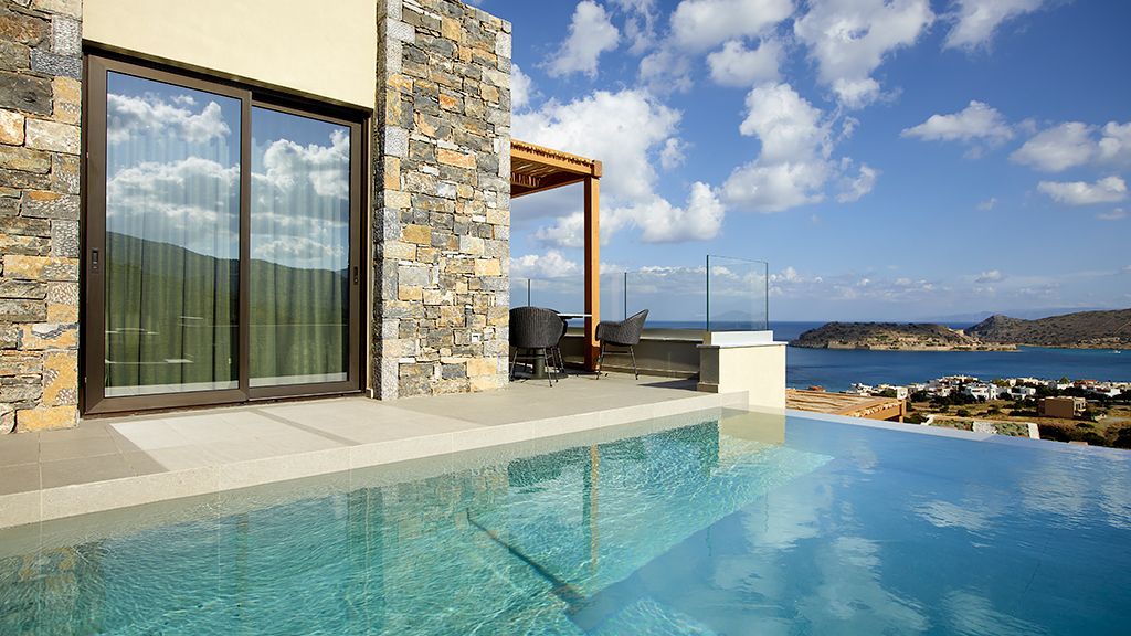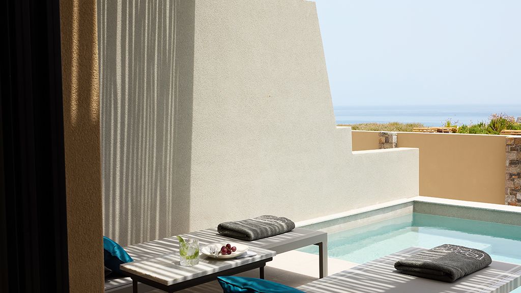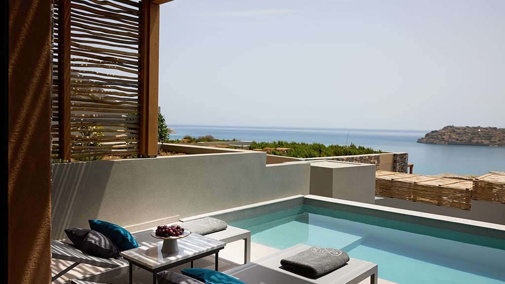 Grand Suite with two pools, sea view, two king beds, shower, Wi-Fi, AC, outdoor living/dining area and minibar.