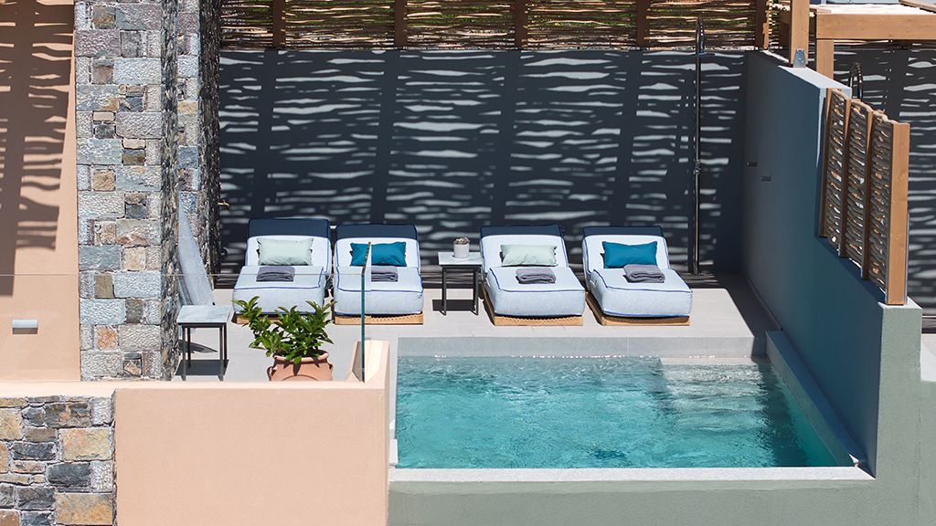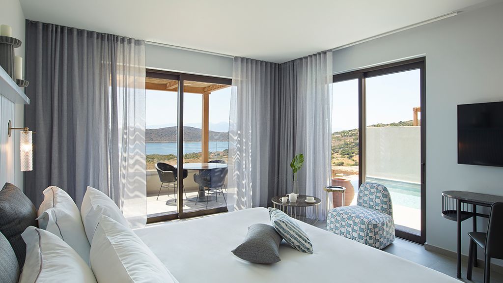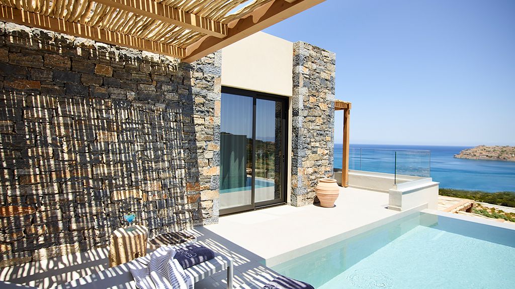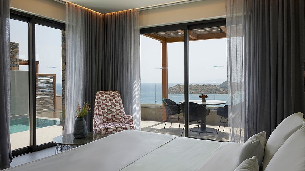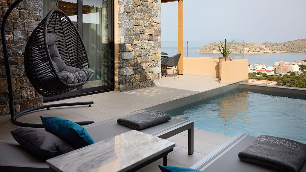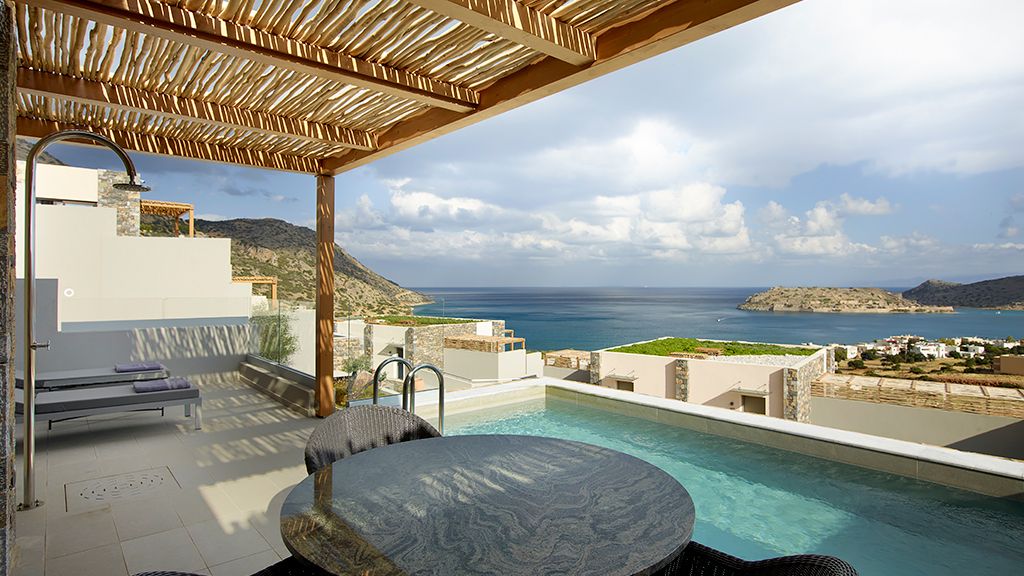Grand Suite with two pools, sea view, two king beds, shower, Wi-Fi, AC, outdoor living/dining area and minibar.