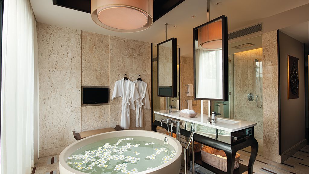 One bedroom villa with waterfront view, outdoor terrace, luxurious bathroom, rain shower and oversized tub.
