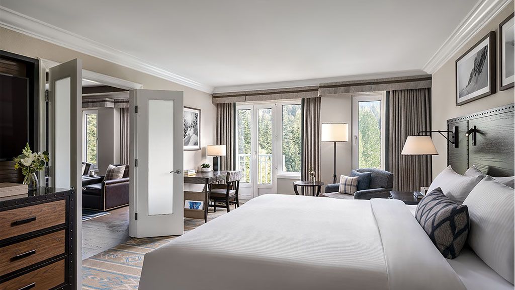 Features 1 King bed, Double sofa bed, living room, Woodland or Rainbow Mountain view, dual gas fireplace, sitting room, five-piece marble bathroom with soaker tub and oversized shower. Includes a flatscreen TV, Wi-Fi Internet, coffee and tea maker, hairdryer, safe, private check-in, complimentary breakfast, Fairmont Gold concierge service and access to the exclusive Fairmont Gold Lounge.