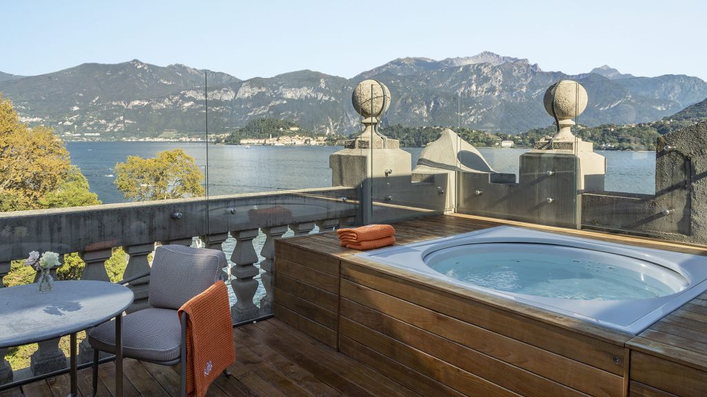 This suite boasts a classic but yet contemporary style. The bathroom in Lasa marble features steam bath and Jacuzzi. Features a king or twin bed, Jacuzzi, two separate rain showers, steam bath, double basin, a direct view over the blue of the lake from the living room.