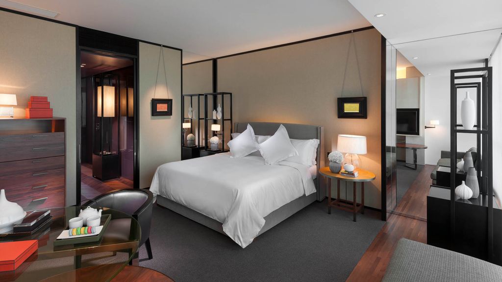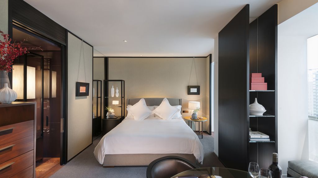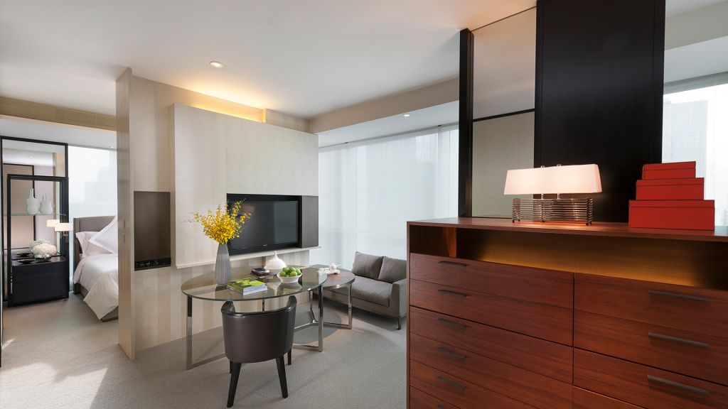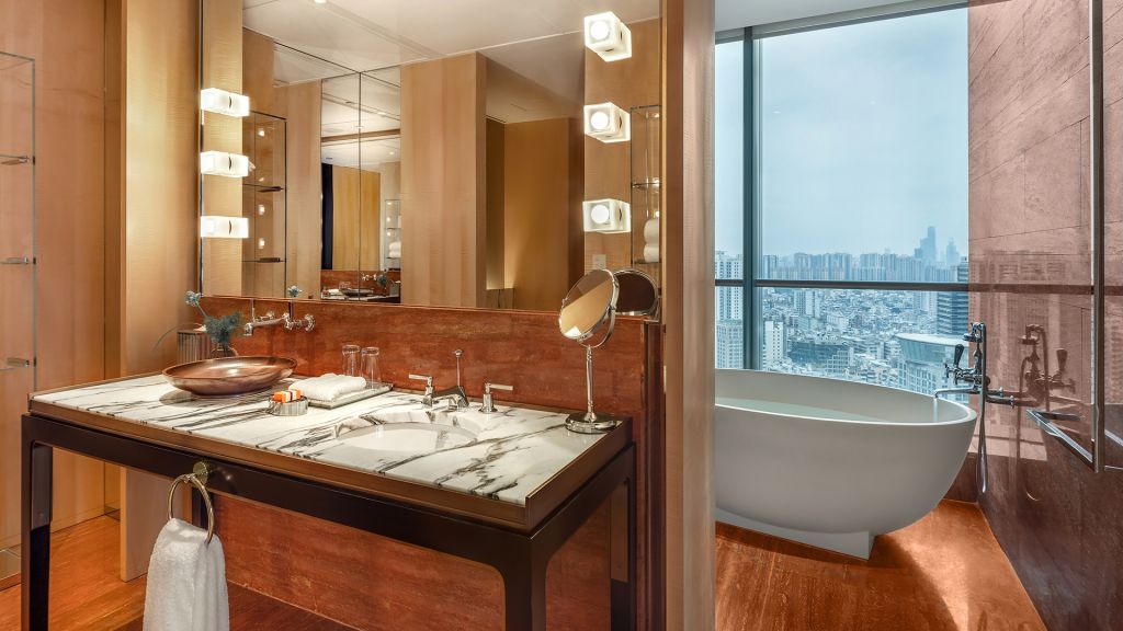 These spacious rooms enjoy the enviable benefit of being the largest entry-level rooms in guangzhou. Overlooking the city’s sweeping skyline, each room is entered via a private foyer, adjacent to which lies a walk-in closet that provides convenient storage for clothes, suitcases and shopping. Boasting dramatic floor-to-ceiling bay windows, elegant wood furnishings and thoughtfully selected artwork, rooms enjoy a sophisticated feel. Bathrooms are particularly striking and divided into two separate zones, one featuring a dry area with a toilet and basin, and the other a wet area with oversized bathtub and glass-enclosed, walk-in shower.