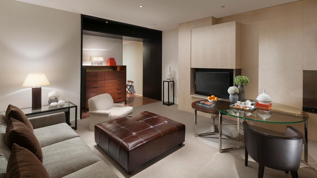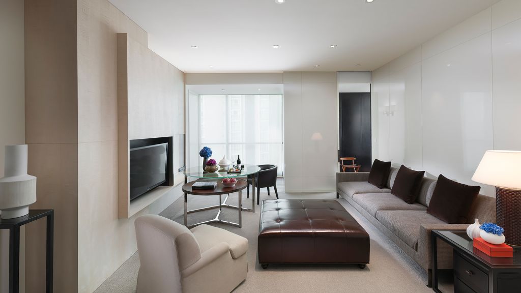 Suites are located at the northeast corner of the hotel and feature a king bedroom, living room with dining table, dressing chamber, walk-in wardrobe and powder room. The marble bathroom offers a large bath and rainforest shower.