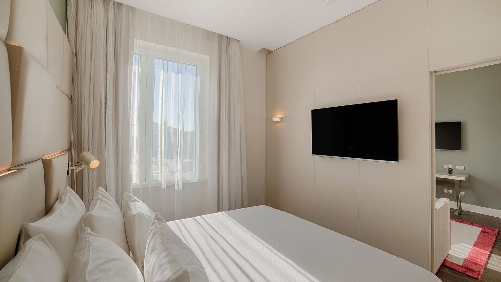Features 1 Double bed, sofa bed and a living room. Includes bathroom amenities set, minibar, safe, hairdryer, baby crib, bathrobes, gym access and slippers. Pets allowed.