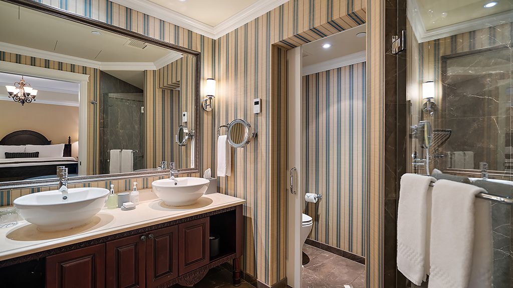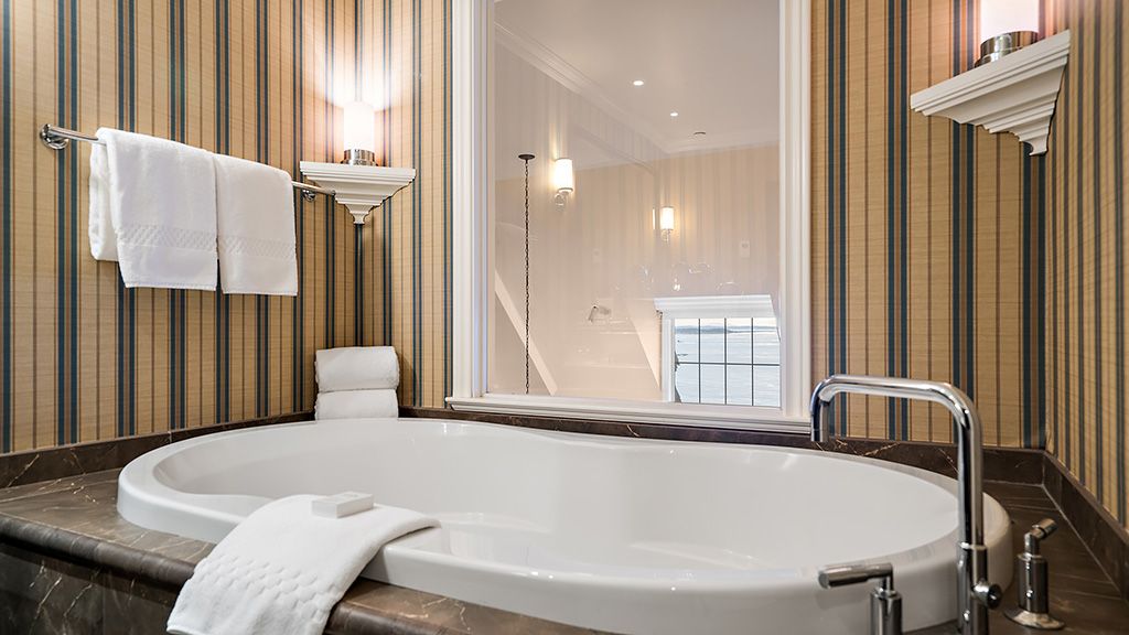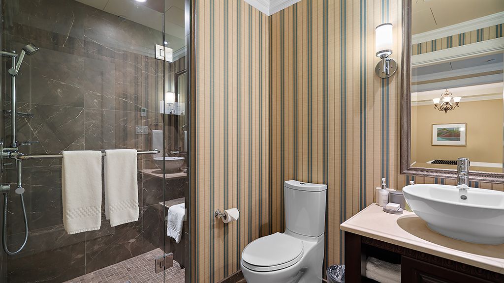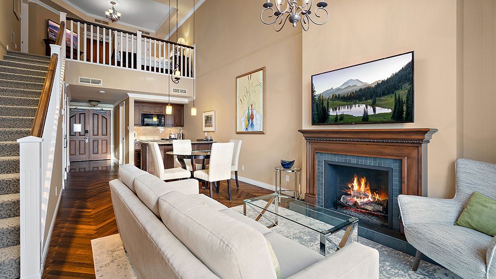 Residential View, Guestroom with King bed, air-conditioning, a fireplace, a wet bar, a dining area, as well as a spa-inspired bathroom with heated tile floors and deep soaker tub.