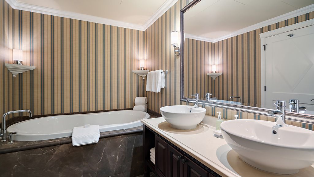 Room with queen beds, large bathroom and ocean views.