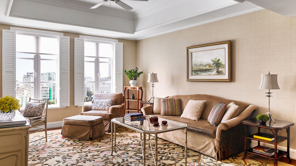 Enjoy the panoramic view of energetic Saigon from this 78 sq m (839 sq ft) suite, offering a separate living area with tall bay windows and wooden flooring