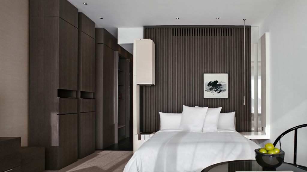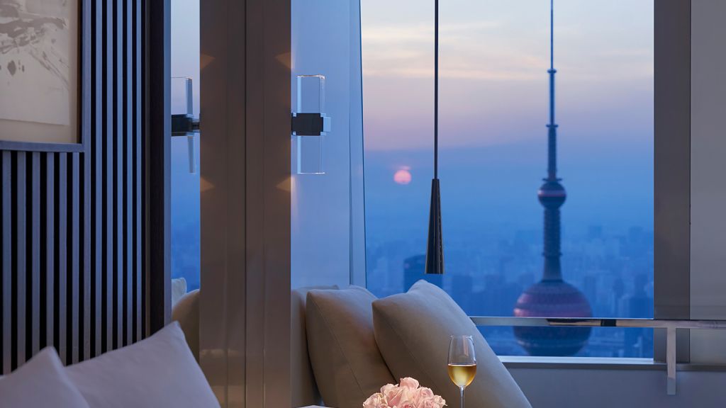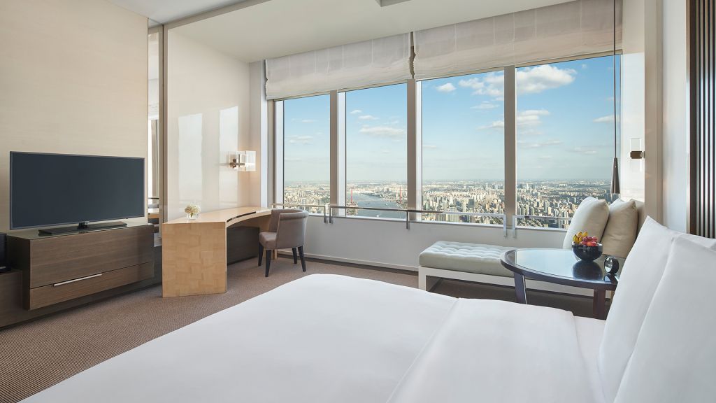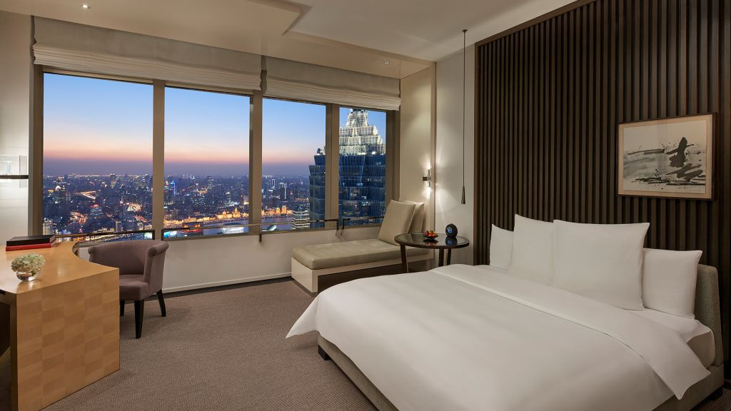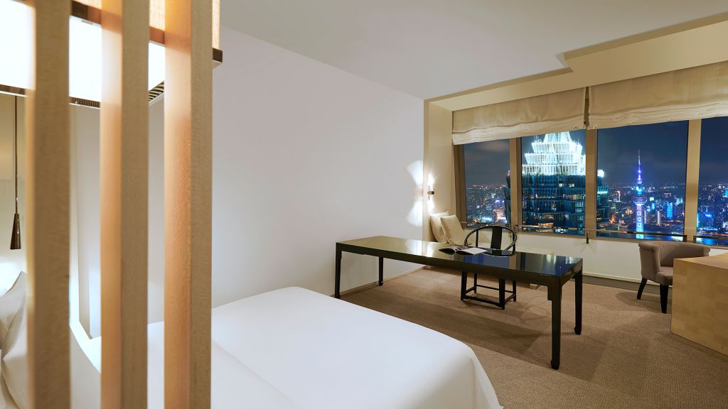 Relax in this 55-to-60-square-meter standard room offering city views in the heart of Shanghai. This modern Chinese residence features one king-size bed, a window-side daybed, a walk-in closet, a separate powder room for privacy with a Washlet, and a deluxe bathroom with a walk-in rain shower and deep soaking tub.