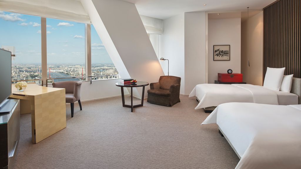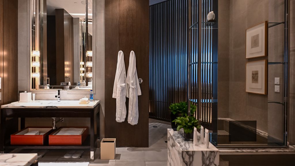 Unwind inside this up to 80-square-meter deluxe room with an expansive view of the Huangpu River and city views. This modern Chinese residence features two twin beds, a walk-in closet, a separate powder room for privacy with a Washlet, and a deluxe bathroom with a walk-in rain shower and deep soaking tub.