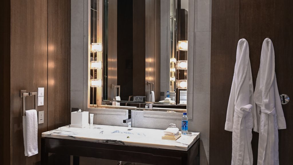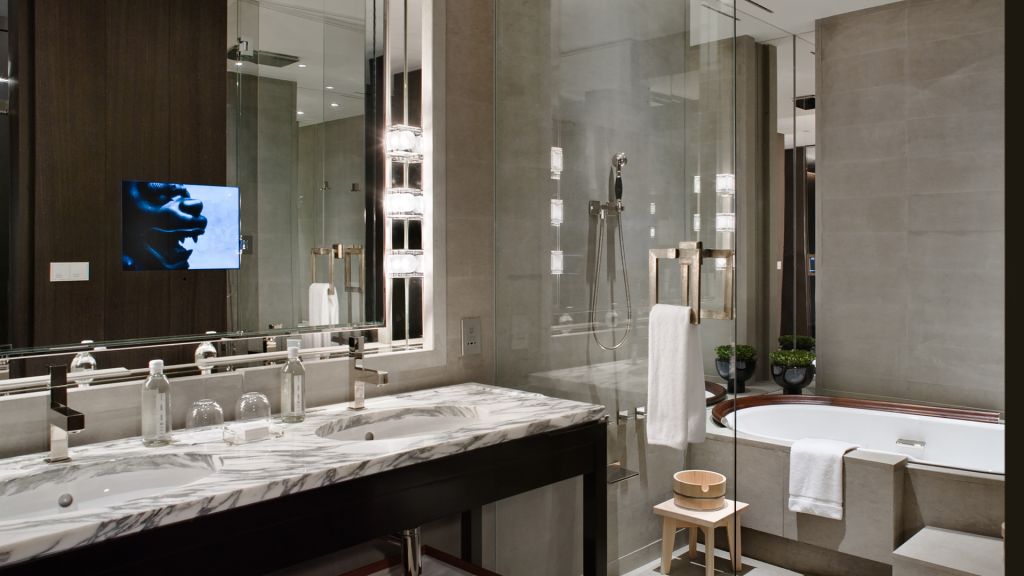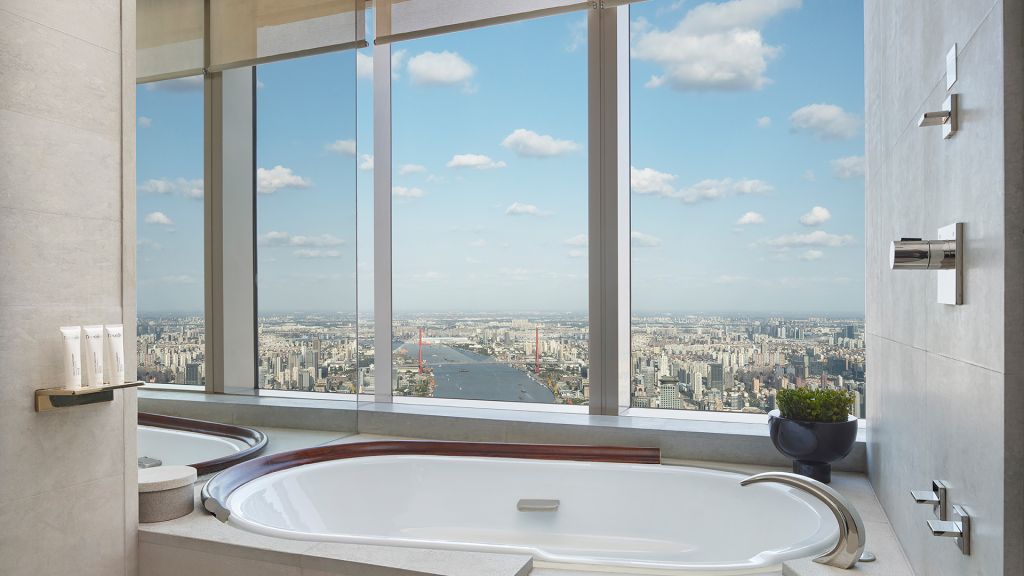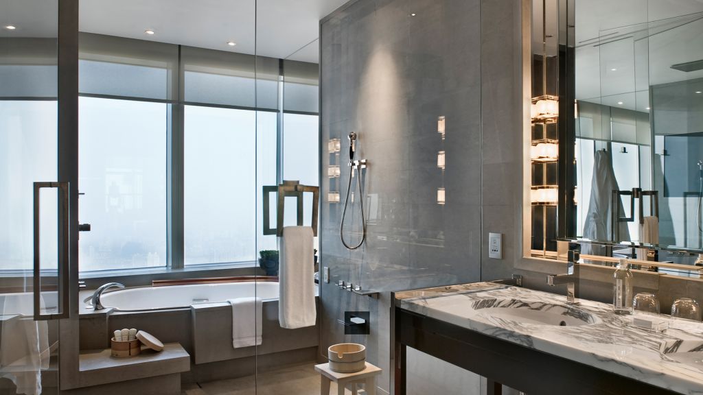 Overlook the architecture alongside the Bund and the Huangpu River from this 55-to-60-square-meter room, which features one king bed, a window-side daybed, a walk-in closet, a separate powder room for privacy with a Washlet, and a deluxe bathroom with a walk-in rain shower and deep soaking tub.